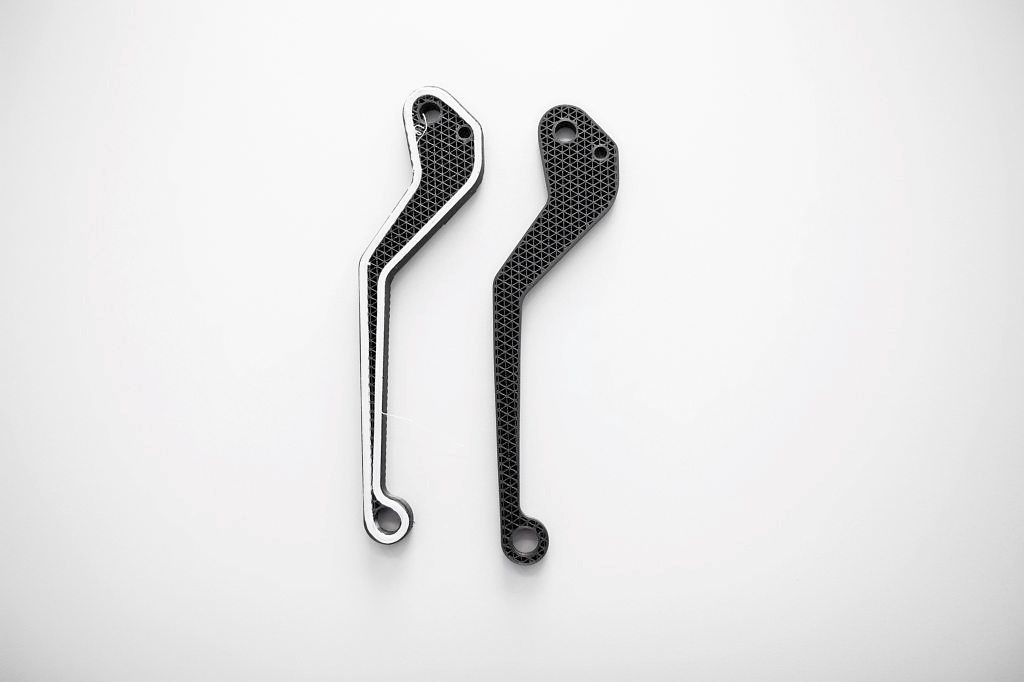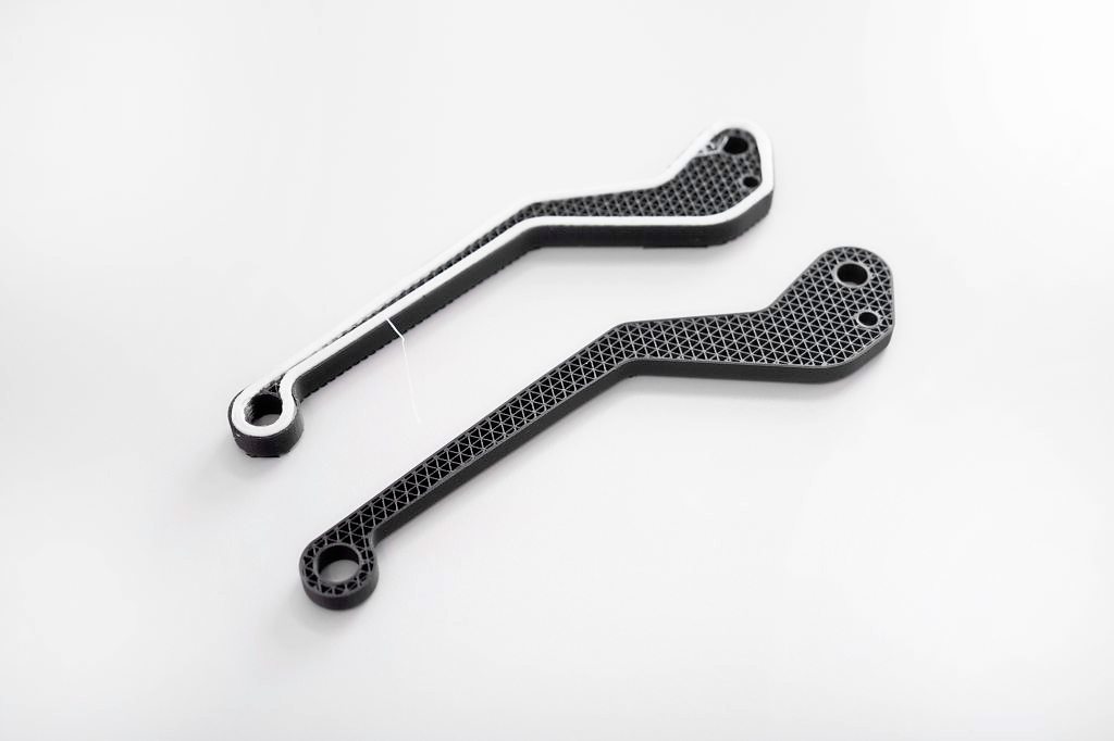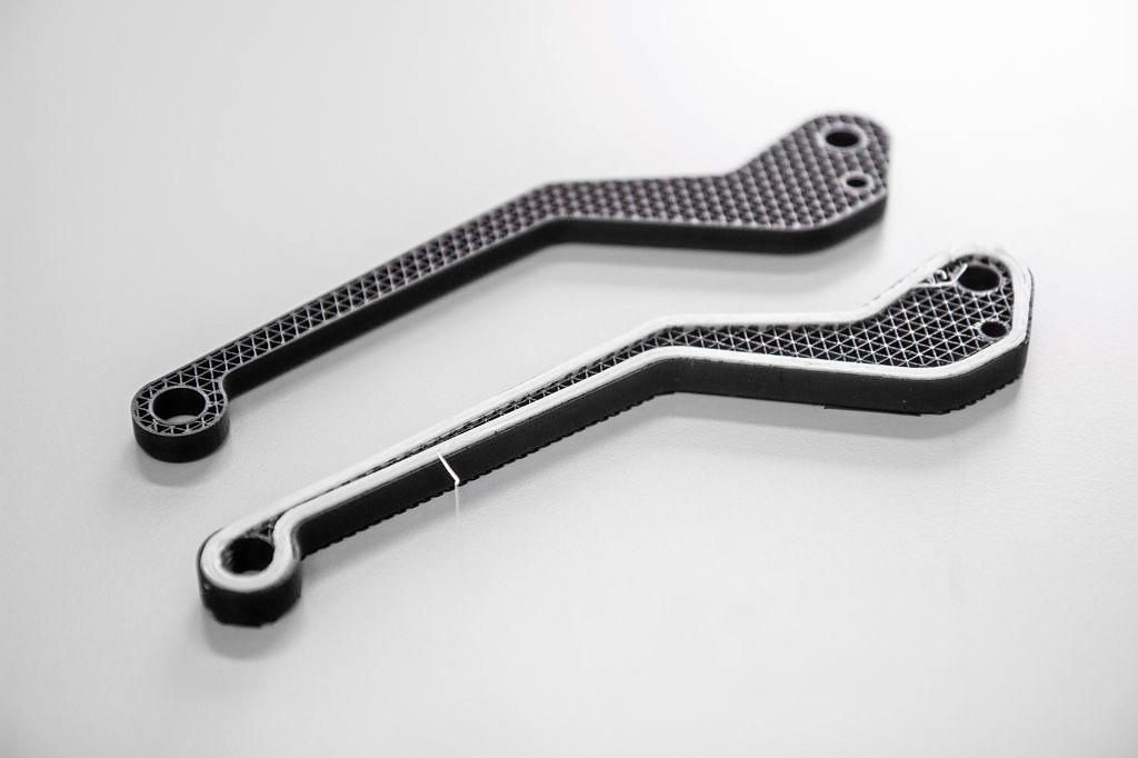 Mark Two verwendet die Continuous Filament Fabrication (CFF) Drucktechnologie um Endloskohlefasern oder Kevlar zu drucken. Durch die Nutzung des CFF- und FFF-(Fused Filament Fabrication)Druckkopfs und unter Verwendung der einzigartigen MarkForged-Mischung aus Nylon mit durchgehenden Fasermaterialien können mit dem Mark Two robuste Bauteile gefertigt werden.